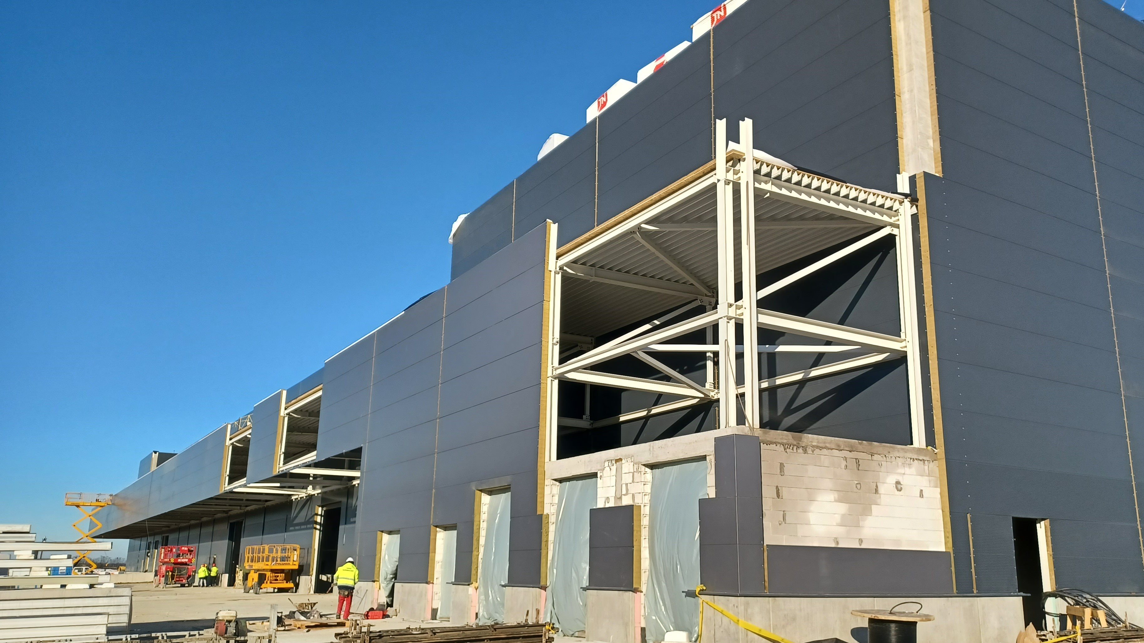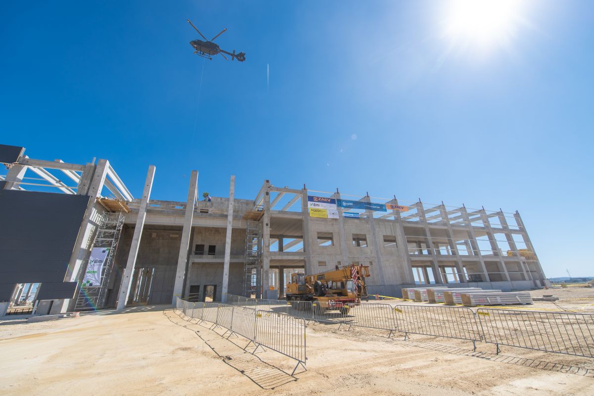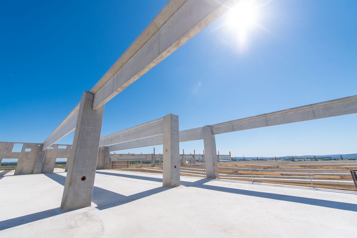 The main building houses the vehicle production lines and is complemented by several auxiliary structures – including freight and personnel gatehouses, a car wash and an EMC building where the vehicles are tested. The primary structure of the main hall combines precast reinforced concrete with steel framing.