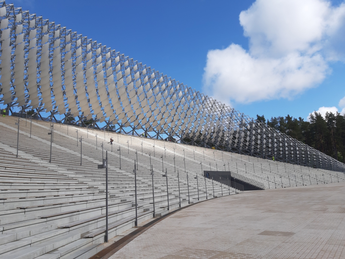 Scena în aer liber realizată în pădurea de lângă Riga reprezintă nu doar un loc emblematic pentru Letonia, ci și pentru întreaga regiune baltică. Structura acoperișului freeform, dublu-curbat, cu o lățime de 134 metri și o înălțime de 37,5 metri, este alcătuită exclusiv din grinzi zăbrelite spațiale realizate din tuburi, utilizând în total 1.800 tone de oțel.